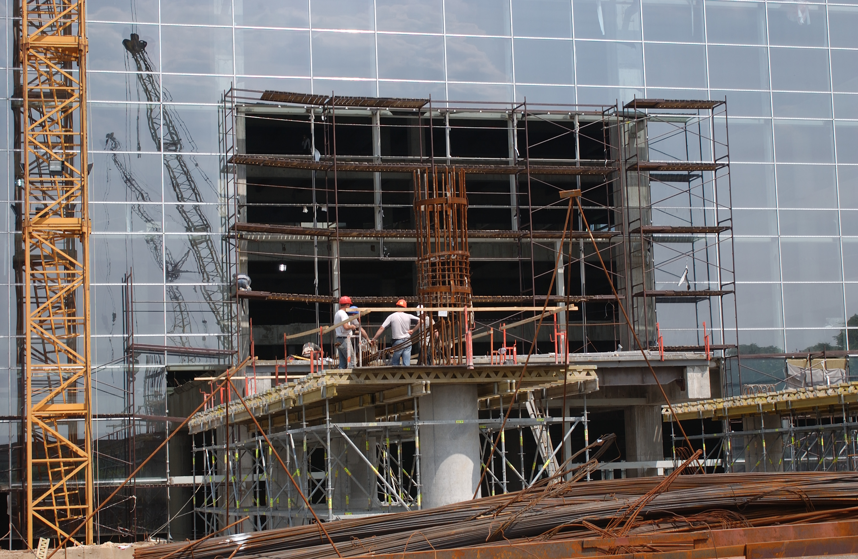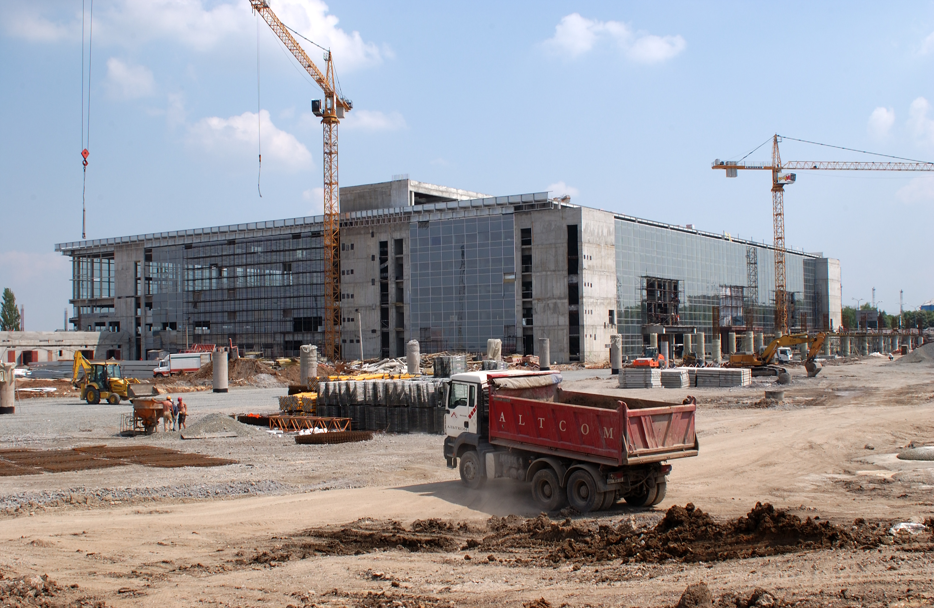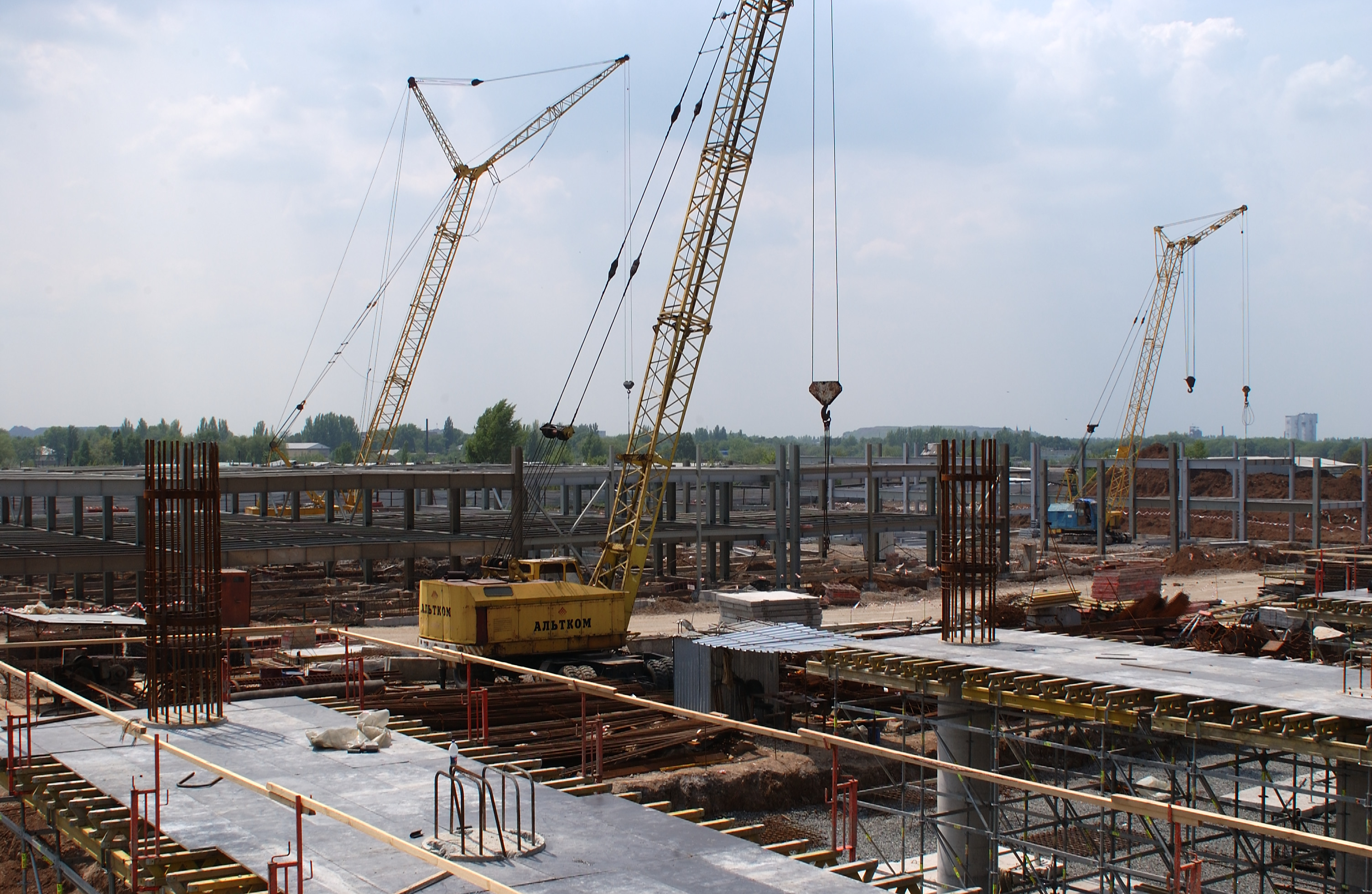 На строительстве терминала КП «Международный аэропорт «Донецк» интенсивно продолжают выполняются отделочные работы на нижних уровнях и втором ярусе здания. Кроме того, уже полностью возведены колонны эстакады, также продолжают возводиться ригели, и выставляется опалубка.