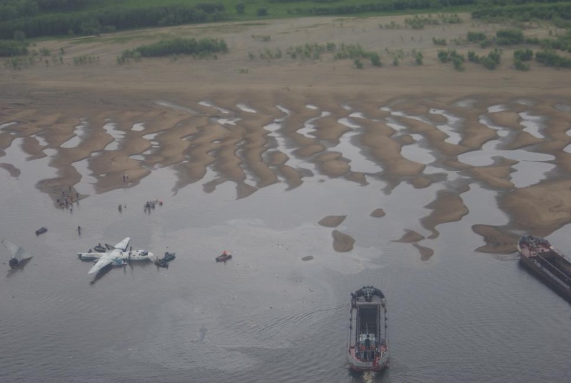 Самолет частично разрушен (фюзеляж переломлен на 3 части) находится мелководье в протоке р. Обь (песчаная коса), возгорания нет.