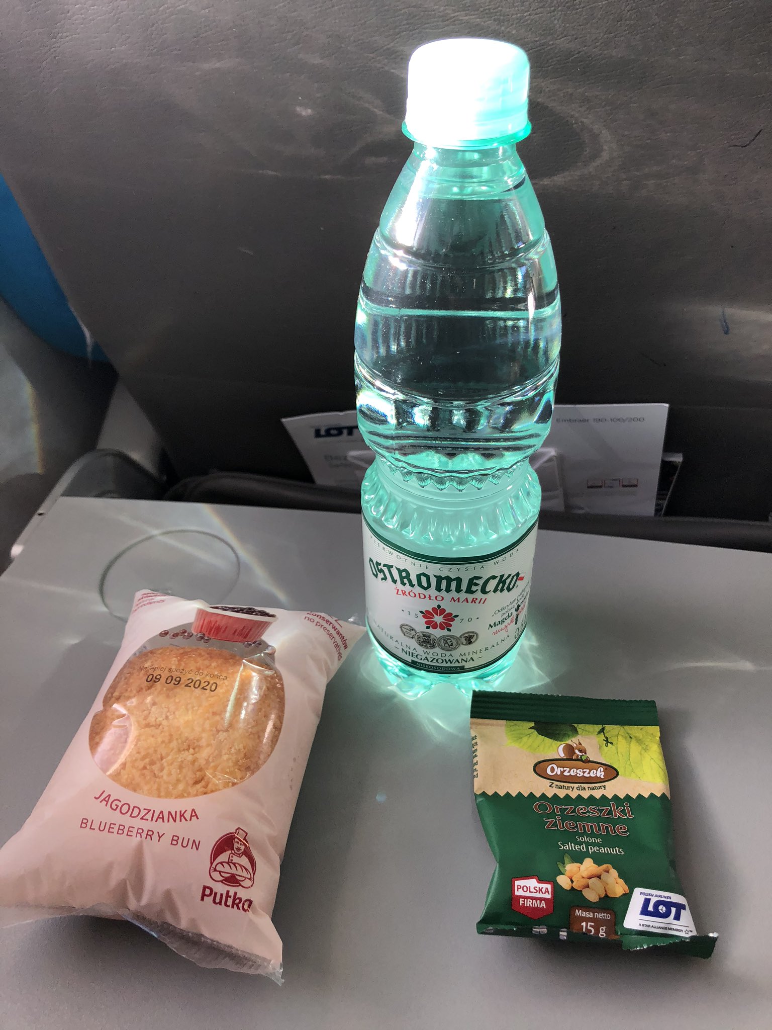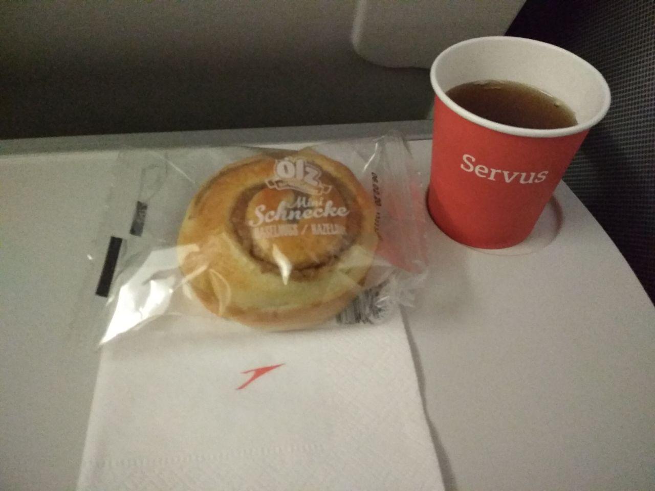 Туди був бутерброд з чорного хліба з яєчно-сирною намазкою і зеленою цибулькою. Смачно, але не завадило б додати туди ще шматочок шинки. З напоїв були кава, чай, соки-води. Хоча, коли я потім ішов в туалет, то бачив групу іспаномовної молоді, яка сьорбала пиво Хайнікен з характерних маленьких баночок, також у возику було вино в пляшечках.