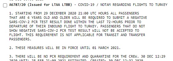 Passengers flying to Turkey or another country via Turkey are required to submit a negative PCR test, sampled maximum 72 hours prior to their flight, as per the current regulation in Turkey. This procedure will be in effect as of 30 December 2020 12 AM, with the local dates and times of the departure countries. There is no obligation to submit a test result for passengers under 6 years old.