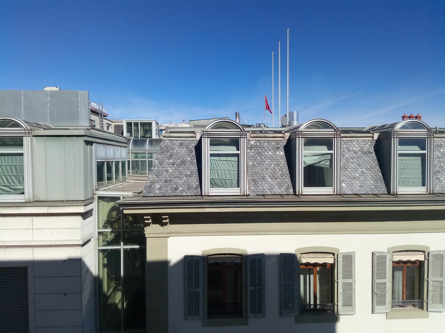 Виды из окон этих номеров - козырные. Озеро и вдалеке Монблан. Атриум отеля. Некоторые места отеля немного затасканные и нуждаются в реновации. Но, уверен, за этим не заржавеет. Отель постепенно проводит реновацию не закрываясь целиком от постояльцев.