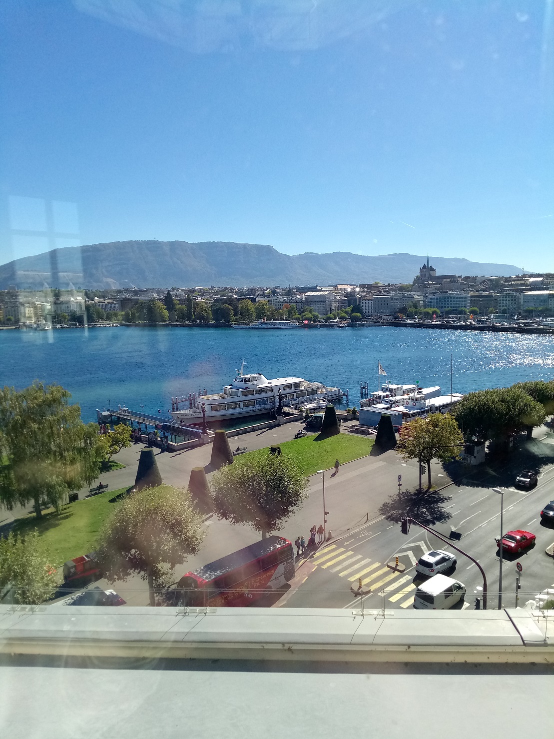 Виды из окон этих номеров - козырные. Озеро и вдалеке Монблан. Атриум отеля. Некоторые места отеля немного затасканные и нуждаются в реновации. Но, уверен, за этим не заржавеет. Отель постепенно проводит реновацию не закрываясь целиком от постояльцев.