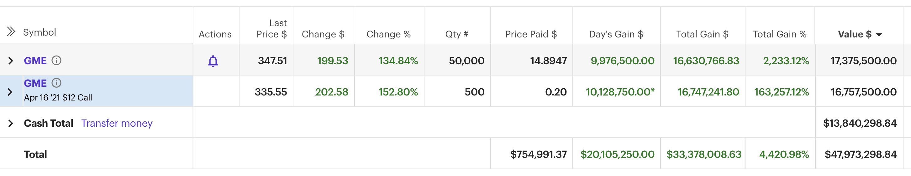 Кстати, вот скрин везунчика DeepFuckingValue, с которого началась движуха, прилично поднял, особенно если посмотреть на опционы. И ведь это не всё. В начале у него было 4 разных опциона по 1000, остался один на 500 штук. И было 10 тысяч акций, осталось 5, то есть он и фиксанул уже немало.