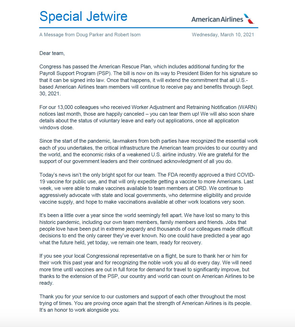 Завдяки фінансовій допомозі від уряду США, American Airlines вже не не відправляє 13,000 працівників у неоплачувану відпустку з 1 квітня.