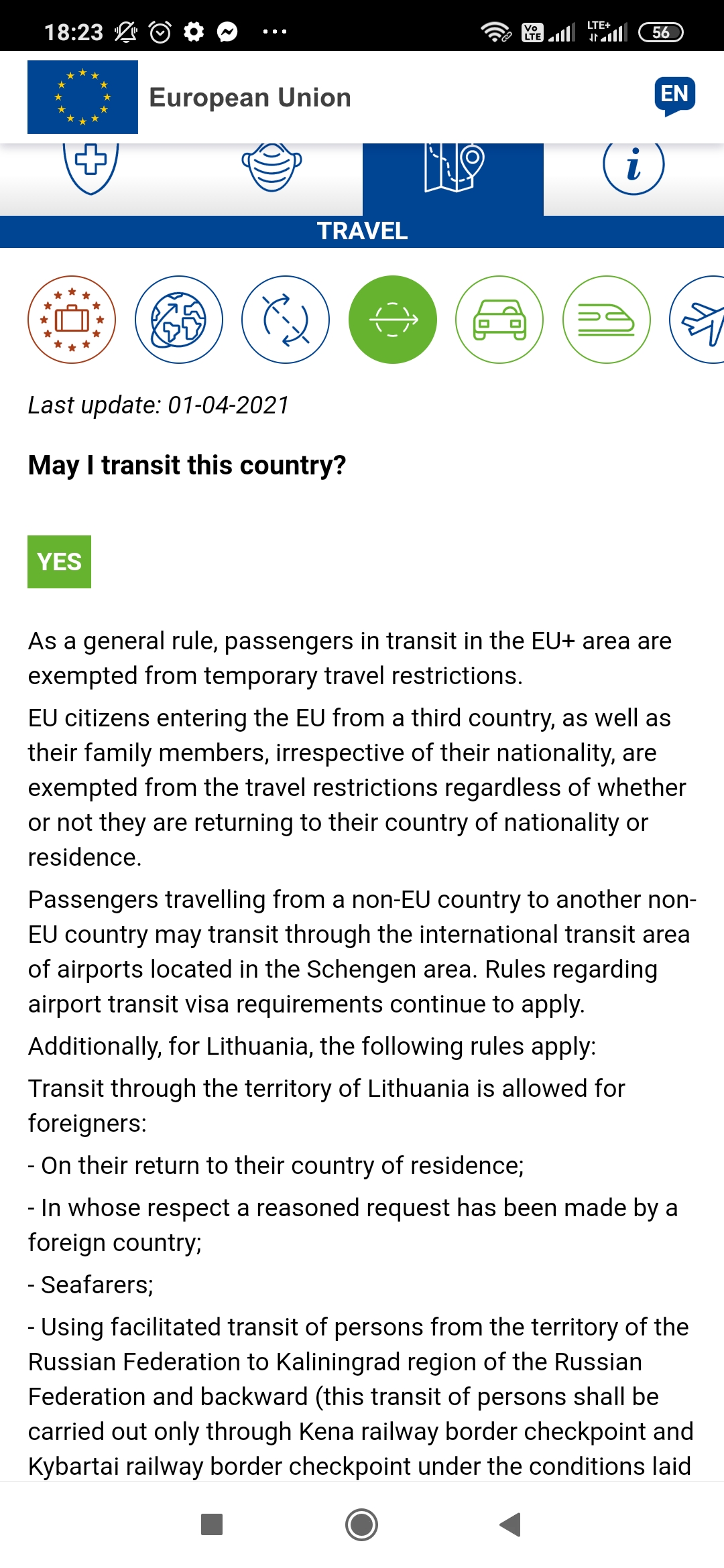 Regardless of the transport used by travelers in transit through Lithuania, it is not necessary to fill in the NPHC form and submit your personal data. There is no need for self-isolation or negative test result, if you travel by air transport and you do not leave the transit area at the airport.