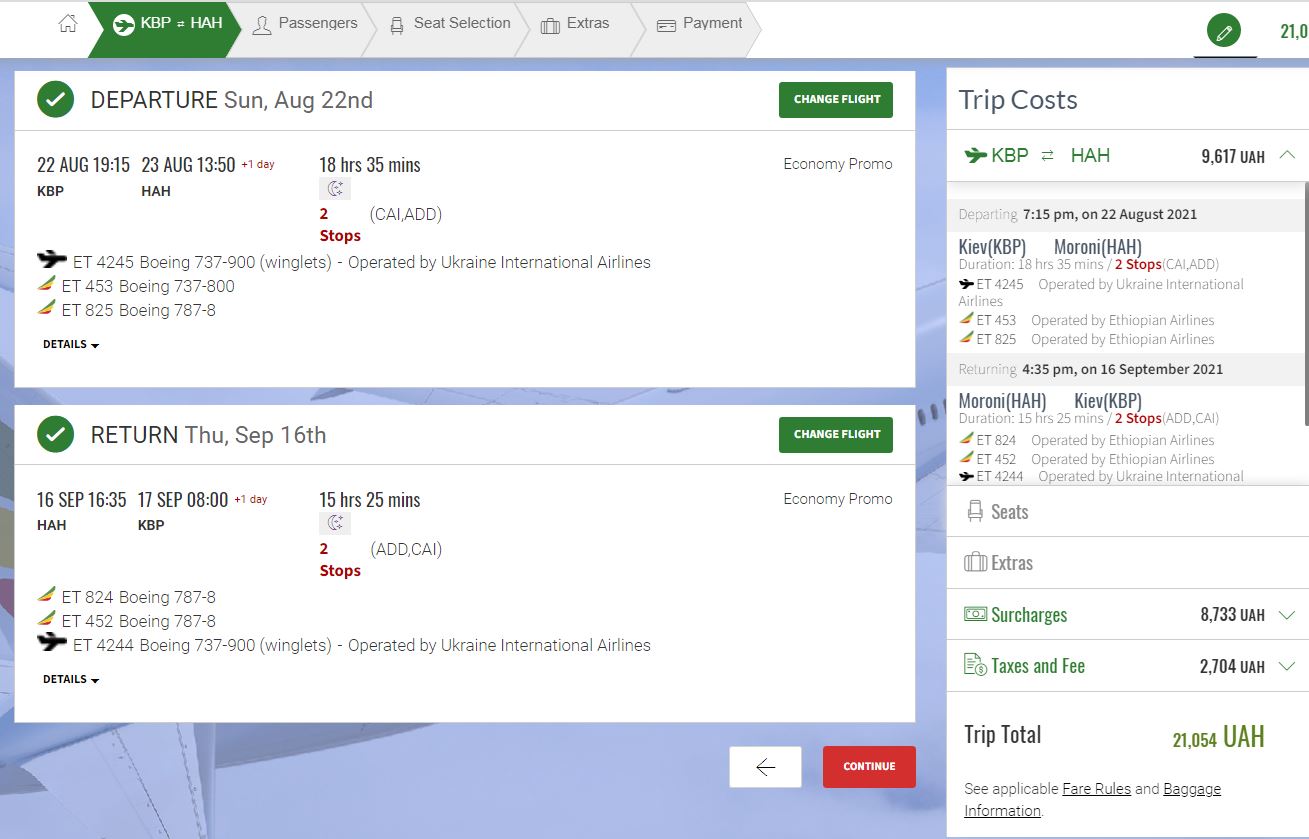 Однак, якщо шукати маршрут на Кayak, з'являються посилання на сайт Ethiopian Airlines де і можна купити єдиний квиток з Києва: