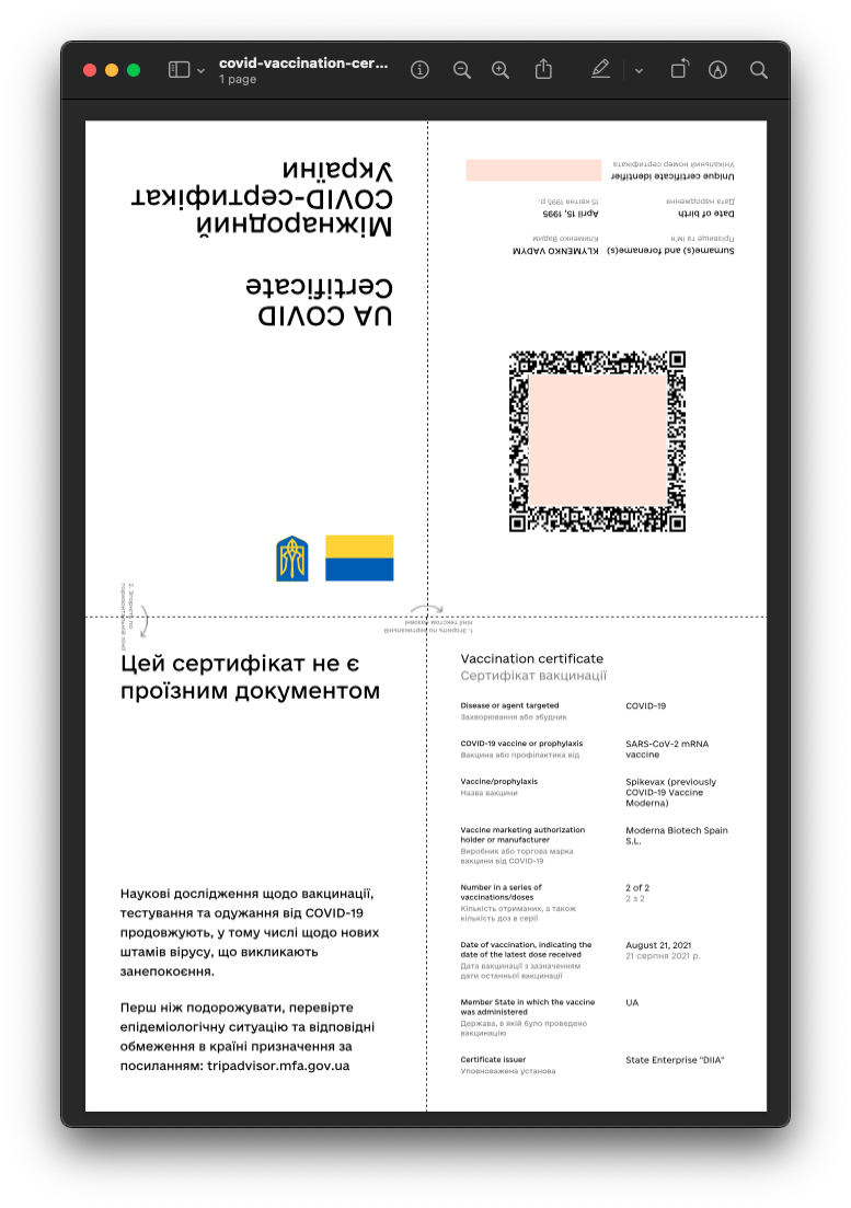 На мою думку, цілком можливо, що незабаром усі сертифікати про щеплення без QR коду оголосять недійсними для міжнародного використання