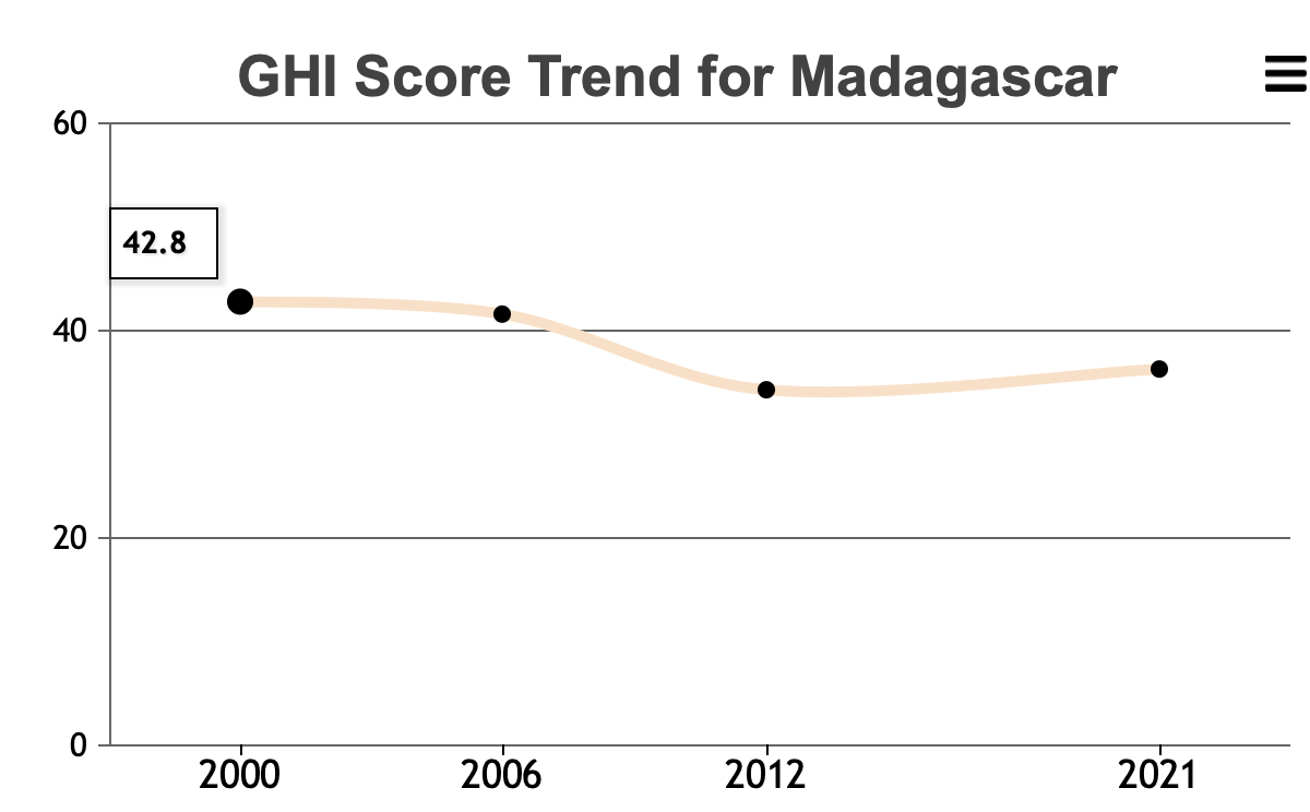 Давайте посмотрим на Мадагаскар: Доступность еды по Global Hungry Index за последние 20 лет улучшилась. А вот в деталях все хуже - красная линия показывает, что % населения с недостатком питания сильно вырос, а улучшение индекса получается за счет других показателей. При этом население Мадагаскара, как и большинства других африканских наций за последние 20 лет практически удвоилось. То есть, еды в стране за последние 20 лет стало существенно больше: