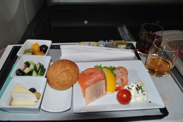 Їжа була досить смачною та достатньою для перельоту 1г.40хв. Склад: пиво Tuborg, галетний крекер, бутерброд з курятиною, салат з томатів та моцарели, шоколадний мус.