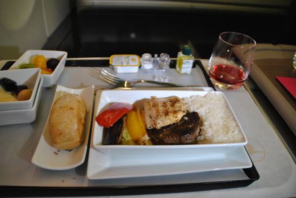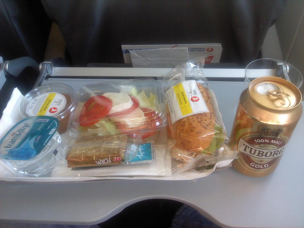 Їжа була досить смачною та достатньою для перельоту 1г.40хв. Склад: пиво Tuborg, галетний крекер, бутерброд з курятиною, салат з томатів та моцарели, шоколадний мус.
