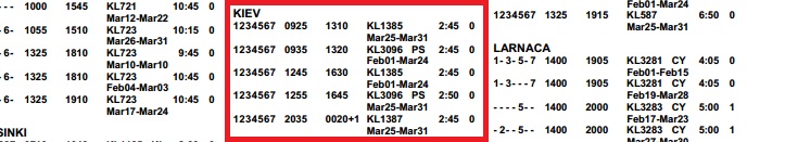 KLM и МАУ полностью меняют расписание между Киевом и Амстердамом. По радио крутят рекламы о 4х ежедневных рейсах. На сайте КЛМ в апреле-мае 3 рейса каждый день (два КЛМ-овских и один МАУ), причём самый ранний рейс из Киева в 6.25 у КЛМ, а МАУ переносит свой на 9.40. Ещё один рейс КЛМ в 14.10 вместо уже давно привычных 17.30. Вылеты из Амстердама: у МАУ в 12.55, а у КЛМ в 9.25 и 20.35--последний особенно приятен, т.к. позволяет провести целый день в Амстердаме при стыковках с ранних рейсов.
