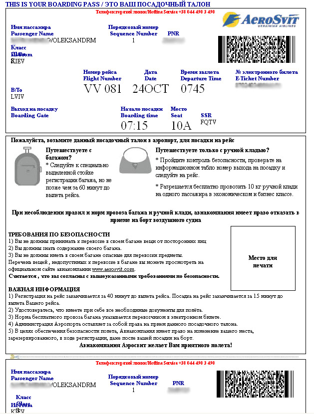 Що є також неправильно, адже не всі в Україні володіють англійською, навіть якщо вилітають закордон.Alexander писав:ну якщо бути чесними, то в МЯУ взагалі тільки англ. версія (попередня сторінка теми)... при тому талон на внутрішній рейс