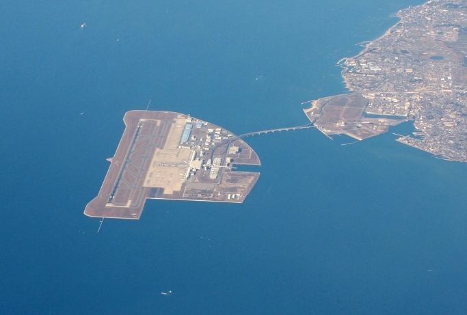 .....сам аэропорт представляет собой искуственный остров в океане , соединенный с материком эстакадой длинного моста (дорога и мост разумеется платные ) . Конструкция расчитана на сильные землетрясения и цунами.