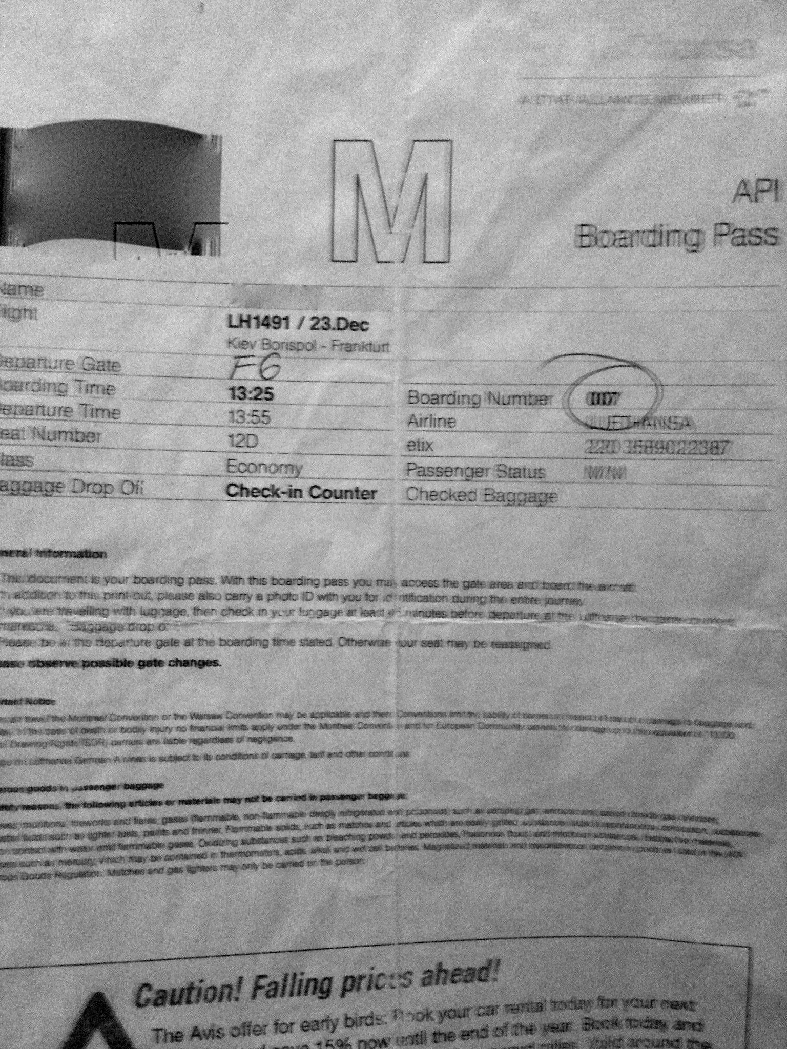Кто подскажет, что означает на ЛХ посадочном талоне, распечатанном через интернет, строка Boarding Number?