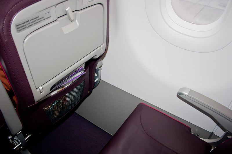 Приоритетников пускают первыми, их место в автобусе отгорожено лентой. Затем в этот же автобус пускают всех остальных. Поехали... Проехав метров 300, встали на летном поле минут на 15. Погода была отличная, солнце припекало. В итоге водитель все же открыл двери, чтобы можно было подышать свежим воздухом. Подъехав к самолету, вначале водитель открыл двери той части салона, в которой располагались приоритетники. Как только они вышли, выпустили всех остальных. В UR-WUC установлены кресла нового образца. Они более тонкие и не откидываются, но благодаря этому увеличено пространство для ног. Сложилось впечатление, что это пространство больше в носовой части салона (примерно на 5 см по сравнению со старыми бортами), чем в хвостовой (больше примерно на 3 см).