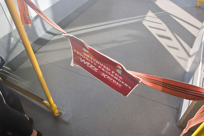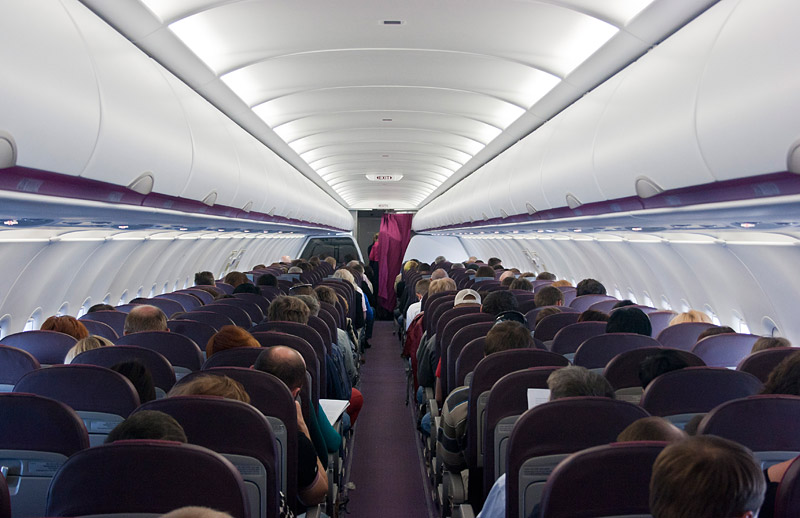 Приоритетников пускают первыми, их место в автобусе отгорожено лентой. Затем в этот же автобус пускают всех остальных. Поехали... Проехав метров 300, встали на летном поле минут на 15. Погода была отличная, солнце припекало. В итоге водитель все же открыл двери, чтобы можно было подышать свежим воздухом. Подъехав к самолету, вначале водитель открыл двери той части салона, в которой располагались приоритетники. Как только они вышли, выпустили всех остальных. В UR-WUC установлены кресла нового образца. Они более тонкие и не откидываются, но благодаря этому увеличено пространство для ног. Сложилось впечатление, что это пространство больше в носовой части салона (примерно на 5 см по сравнению со старыми бортами), чем в хвостовой (больше примерно на 3 см).