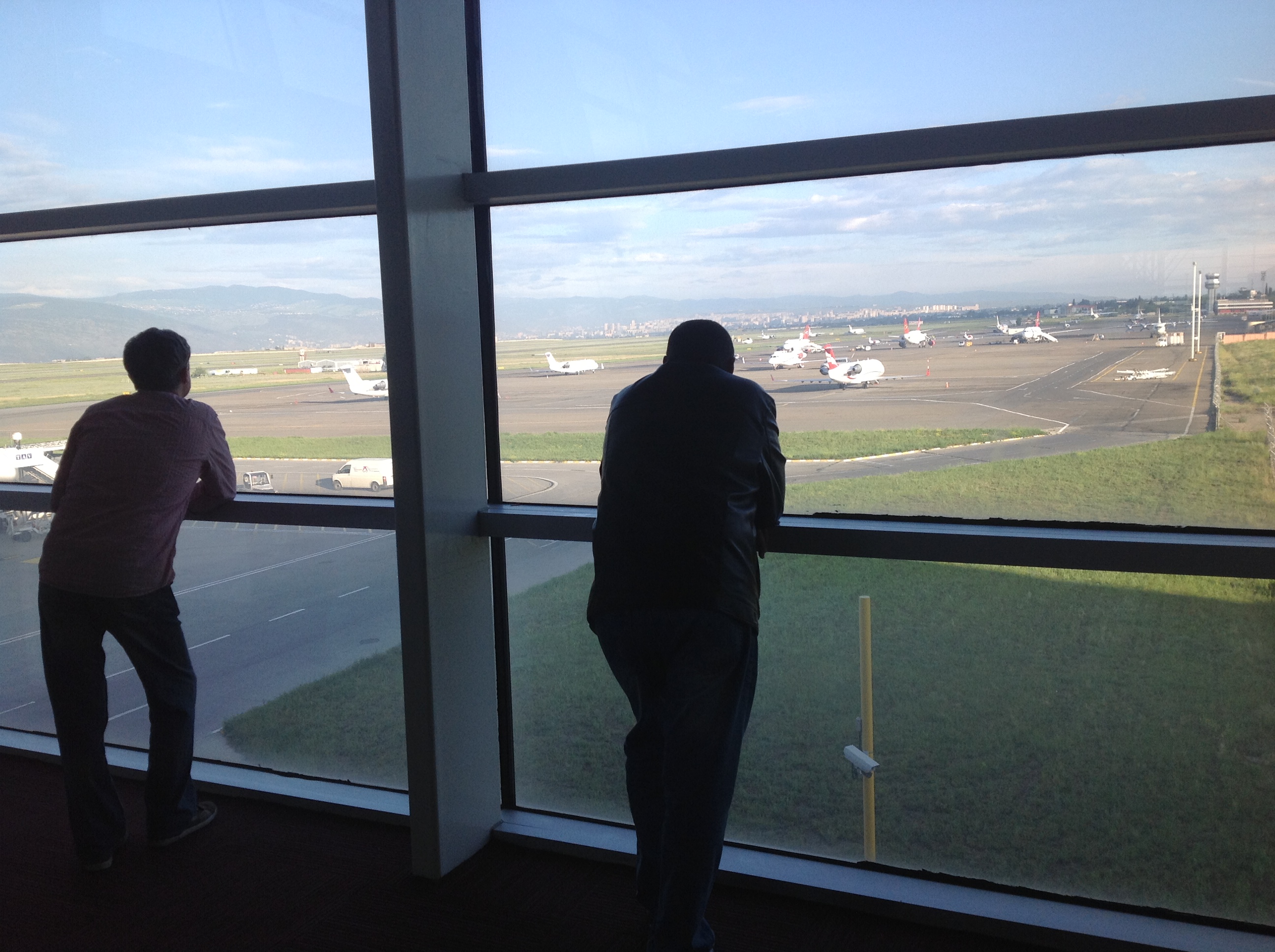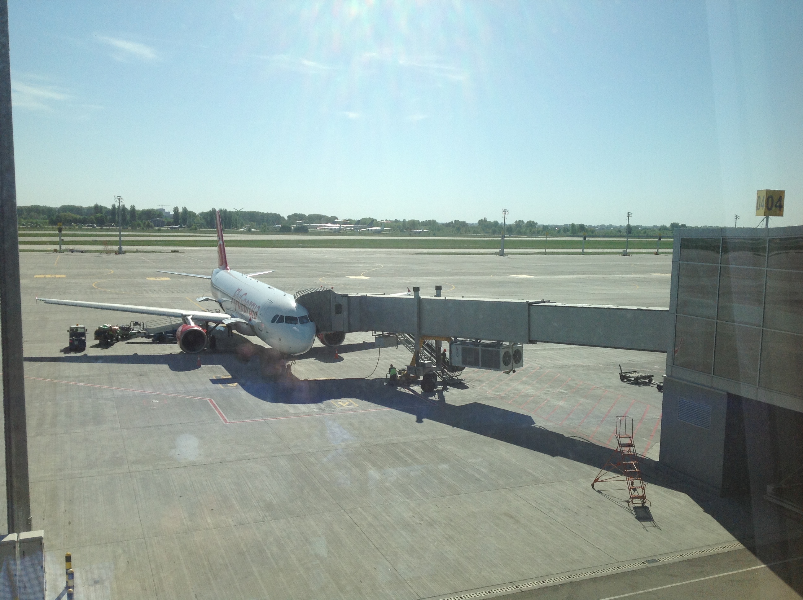 В Тбилиси у самого терминала (т.е. у телетрапов) не стояло ни одного самолёта. Все стояли слева от него метрах в 300-х. Соответственно, высадка через автобус. Вообще, подавляющее количество самолётов на лётном поле были FlyGeorgia и только 2 CRJ Airzena.