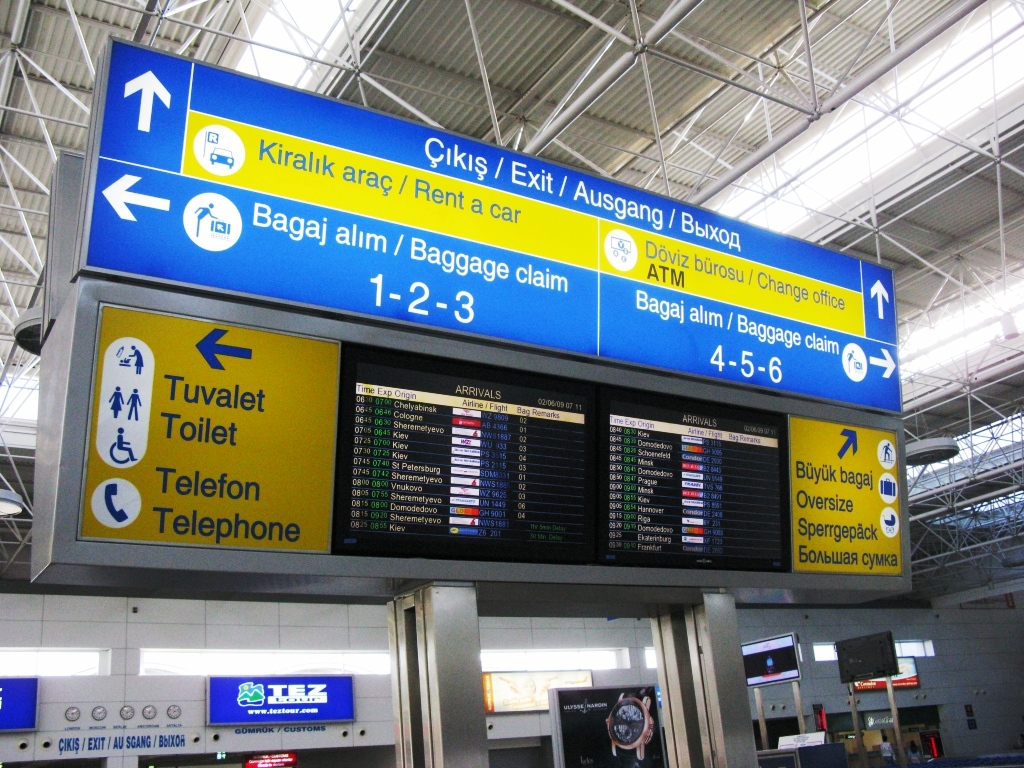 Прилёт Визз осуществляет в Терминал 2. Оттуда добраться, а точнее выбраться можно только на такси - в любой соседний город, ценник есть возле стоянки такси (можно в долларах, евро=разница есть в зависимости от курса, здесь в Украине; что-то типа 30 баксов = 20 евро (в центр Анталии), то есть экономней заплатить в евро - ну и в зависимости от дальности). Если вам хочется добраться ещё дешевле есть служба Havas - типа нашего Атаса - в 2009 стоило около 9 лир, где его искать не знаю, так как воспользовался службой такси. Ещё вариант пройтись пешком до терминала №1 (но это судя по растоянию не близко - около 2-3 км.), там есть городское автобусное сообщение с центром Антальи.