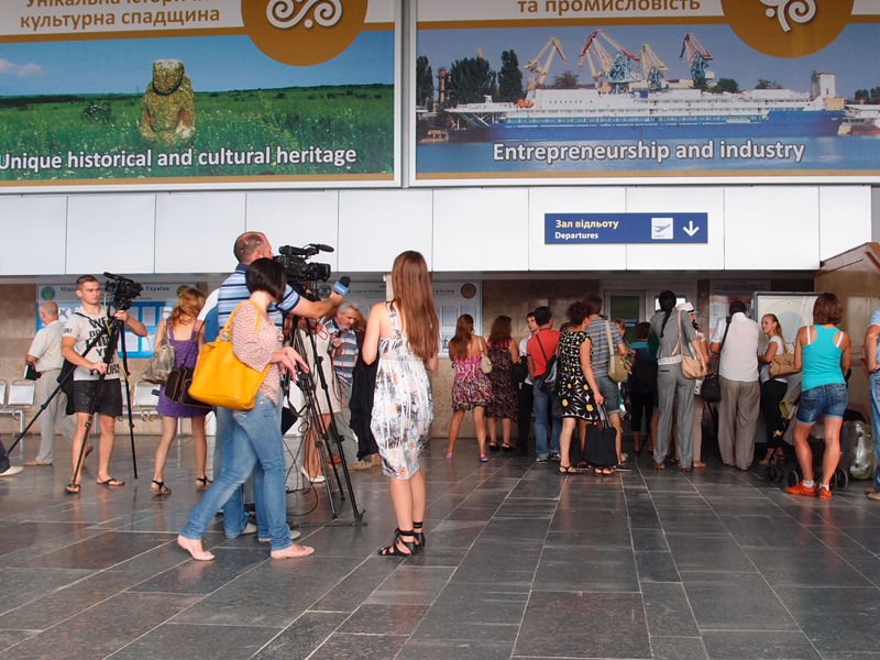 Покупал на сайте компании, оплатил карточкой - никаких проблем с этим не возникло.Вылет по расписанию в 9 утра, поэтому по привычке приехал в аэропорт за 2 часа - в 7 утра. В аэропорту Херсона я до этого не бывал. Терминал удивил размером и выглядит очень достойно. Тем более, что погода стояла отличная. Рядом видна диспетчерская вышка. Зайдя внутрь попадаем во внушительного размера холл, очень светлый, с достаточным количеством мест для сидения. В честь первого рейса играл аккордеонист. В зале также находились работники аэропорта, ребята в национальных костюмах. Там же прохаживались первые прибывшие пассажиры. На единственном табло (других не видал) отображалась информация о единственном же (пока) рейсе. Стойка регистрации в зале одна. Народ периодически подходил и интересовался, не началась ли еще регистрация. Но регистрация началась только около 8:00. К этому моменту подтянулось большинство пассажиров, а также телевидение и пресса. У пассажиров брали интервью. Стойку регистрации окружила плотная дружина людей с фотоаппаратами. Я тоже зарегистрировался. Девушка за стойкой спросила есть ли у меня распечатка билета. Распечатки не было и она слегка растерялась. Но быстро сориентировалась и нашла меня в списке пассажиров. И выдала пустой посадочный талон