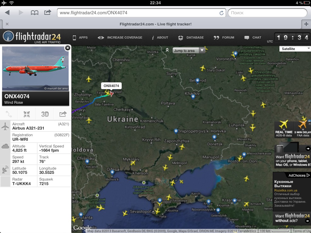 18.07.2013 о 16:52 при виконанні рейсу ONX 4019 за маршрутом Бориспіль-Казань на літаку А-321 UR-WRP авіакомпанії «Роза Вітрів», після зльоту, під час перетину ешелону 210, на обох навігаційних дисплеях бортового навігаційного комплексу періодично почала зникати інформація, замість того висвічувалось повідомлення про недоступність мапи (Map Not Avail). У зв’язку з