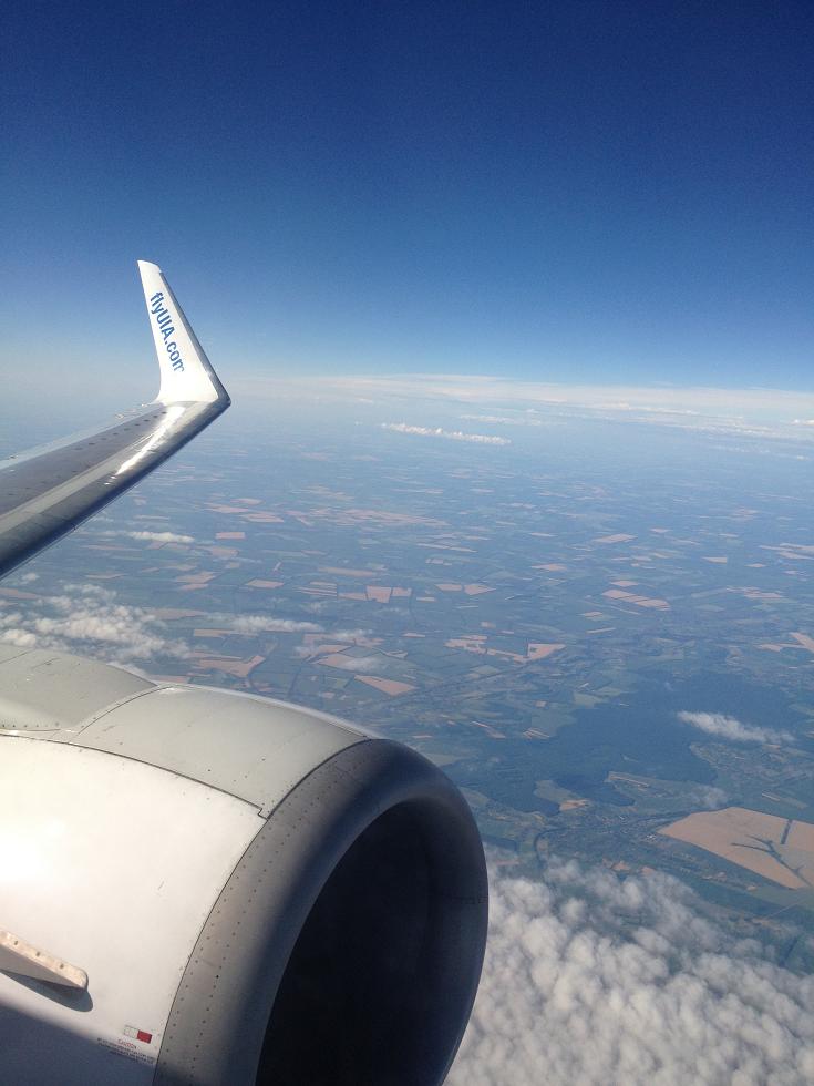 Посадка через автобусный гейт. В бизнесе загрузка 75%, в экономе 101 человек. Для 735 бота очень неплохо. Борт был старенький UR-GBE, бывший аэросвитовский ААК, но состояние бизнес-класса вполне пристойное. На коротком рейсе в 40 минут даже полноценно кормили и поили, причем на завтрак был выбор из курицы и рыбы. Я выбрал курицу. Летели на небольшой высоте, все очень мягко, плавно, стюардессы очень приветливые, погода хорошая. Подушки и пледы даже на внутреннем рейсе уже лежали на креслах. не прошло и 50-ти минут как мы парковались на бесконтактной стоянке возле терминала Д международного аэропорта "Борисполь"...
