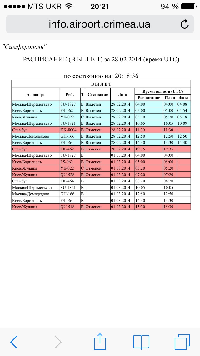 Симферополь (аннексирован Россией) в военной блокаде, все вылеты отменены, еще числится завтра на вылет рейс на Москву.