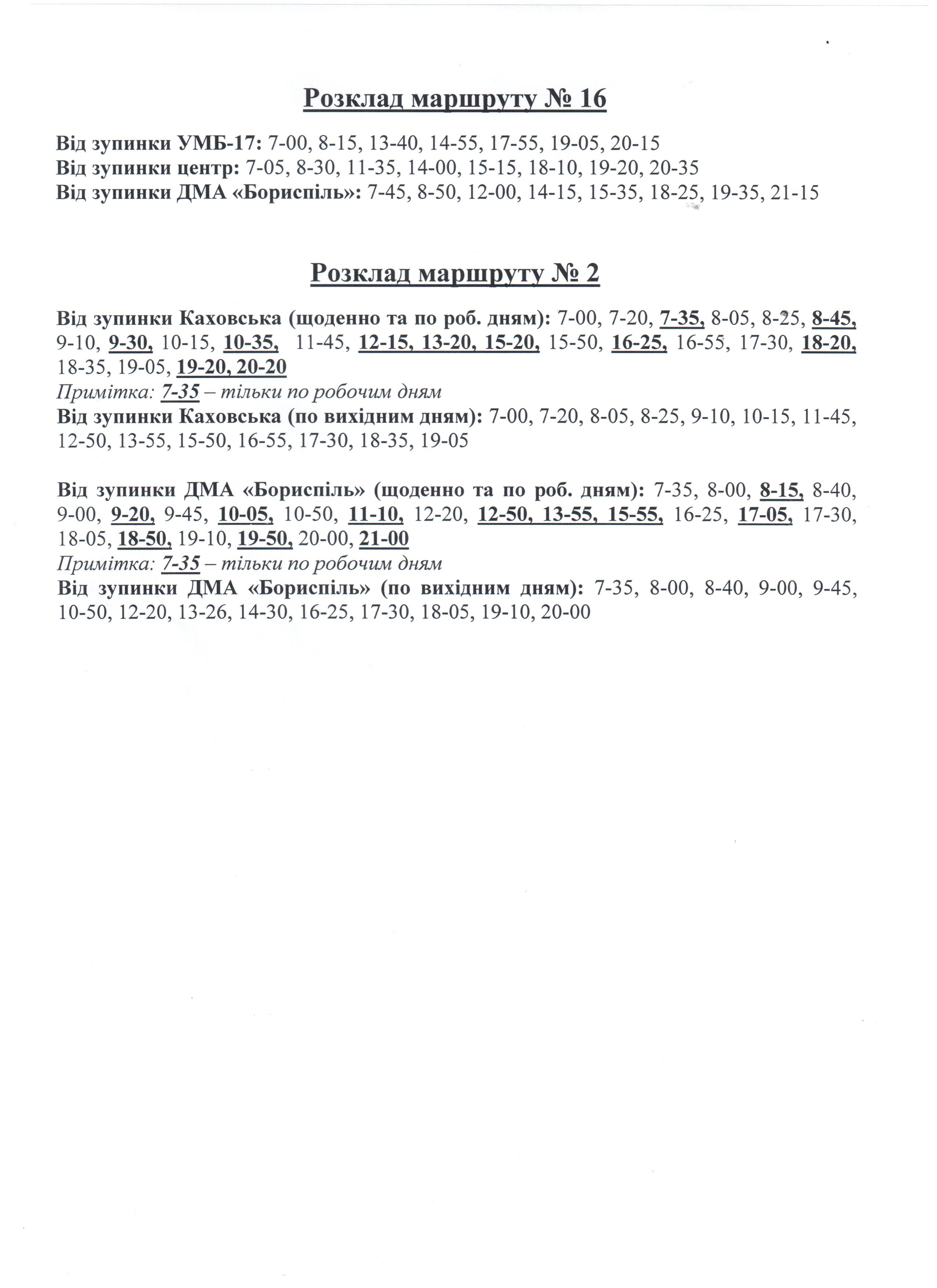 Скидываю Вам расписания № 2 та № 16.E-145 писав:Sky Bus, спасибо. Очень впечатляющий ответ дали, даже больше, чем я хотел. Последнее, хотел бы уточнить, может вы знаете, где можно достать\скачать\переписать свежайшее и актуальнейшее расписание всех автобусов по маршруту Борисполь-Аэропорт. Расписание у меня есть какое-то, но вряд ли оно актуальное, много несовпадений.