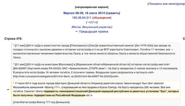 В оригінальному пості "Вікіпедії", пов'язаної з аваріями в цивільній авіації, було заявлено, що Boeing 777, на борту якого знаходилися 298 осіб, включаючи 10 британців, був збитий ракетою, яка була "отримана від Російської Федерації".