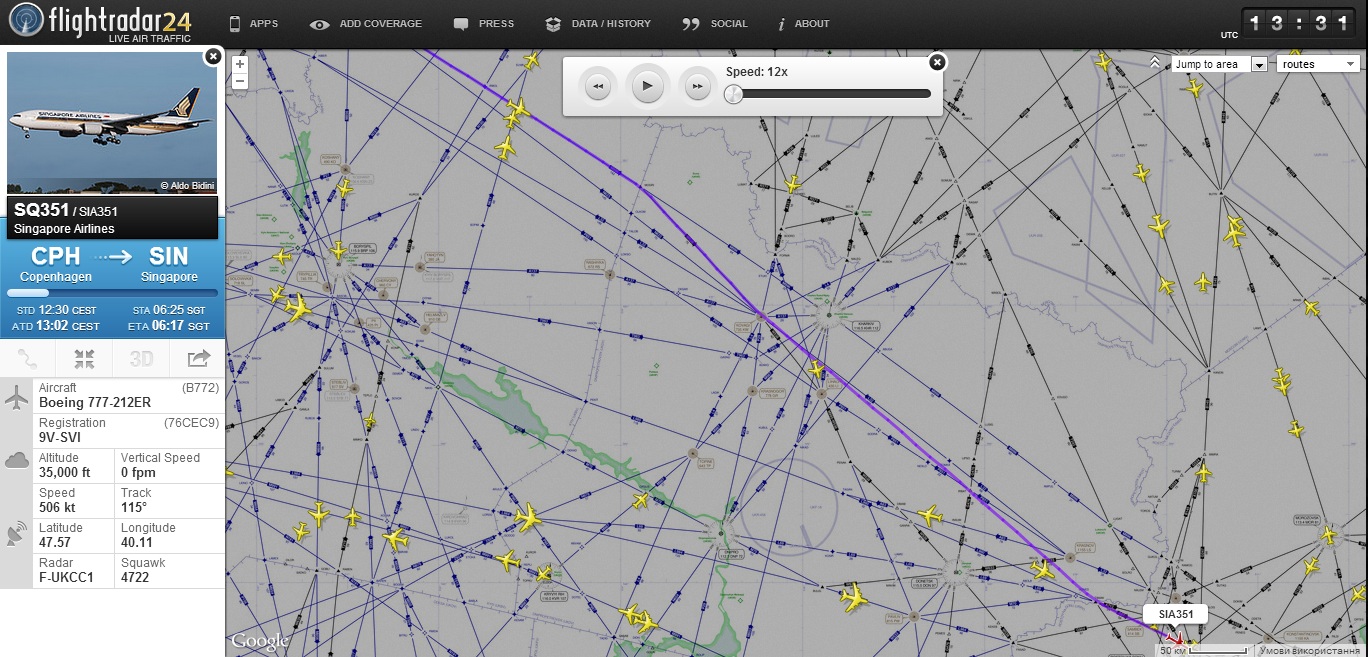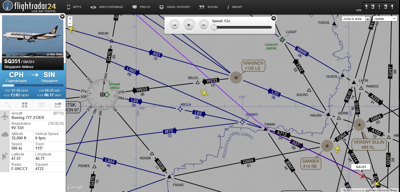 Добрый день. А можно Вас попросить сделать такой-же скриншот для рейса SIA351 17.07 в момент катастрофы. Как этотKKS писав:Здається в цій темі не було інформації про те що борт саме перед Донецькою областю - відхилився від траси.