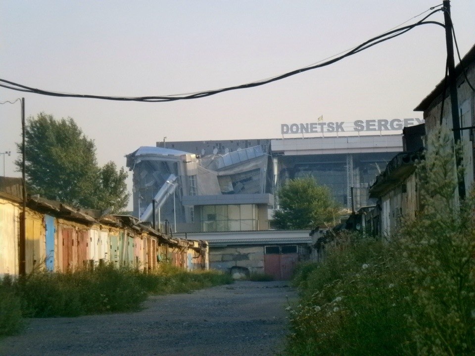 Вот так выглядел фасад нового терминала Международного аэропорта Донецк имени С.С. Прокофьева состоянием на 8 августа 2014 года. Сейчас, насколько я знаю, его не обстреливают из тяжелого вооружения, Грады боевиков, которые его утюжили со стороны Авдеевки, ликвидированы месяц назад. Вполне возможно, что состояние окончательное. Примечательно, что склад ГСМ до сих пор цел, вполне возможно, что боксы со спецтехникой тоже целы.