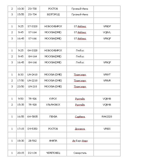 По 3 рейса выполнялись в Ростов и Новосибирск, по 2 рейса - в Краснодар и Екатеринбург. В 10 городов РФ летали по 1 рейсу - Сургут, Сабиха (Стамбул), Волгоград, Нижневартовск, Белгород, Курск, Пенза, Ульяновск, Анапа, Череповец.