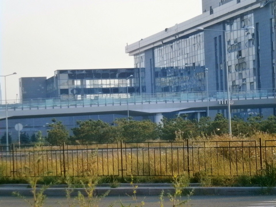 Вот так выглядел фасад нового терминала Международного аэропорта Донецк имени С.С. Прокофьева состоянием на 8 августа 2014 года. Сейчас, насколько я знаю, его не обстреливают из тяжелого вооружения, Грады боевиков, которые его утюжили со стороны Авдеевки, ликвидированы месяц назад. Вполне возможно, что состояние окончательное. Примечательно, что склад ГСМ до сих пор цел, вполне возможно, что боксы со спецтехникой тоже целы.