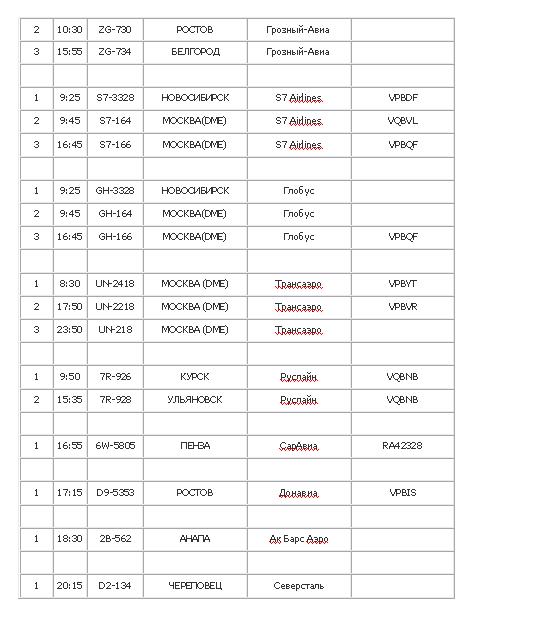 По 3 рейса выполнялись в Ростов и Новосибирск, по 2 рейса - в Краснодар и Екатеринбург. В 10 городов РФ летали по 1 рейсу - Сургут, Сабиха (Стамбул), Волгоград, Нижневартовск, Белгород, Курск, Пенза, Ульяновск, Анапа, Череповец.
