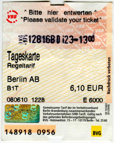 Day Pass Berlin ABC 6,50 Действует с момента компосирования и до 3 часов ночи следующего дня