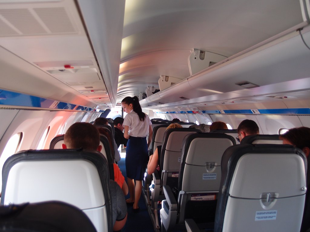 Реєстрація почалася десь за годинку до вильоту. За моїм проханням отримав місце в кінці салону. Будьте уважні, спинки крісел в 11 ряду не відкидаются назад. Проте, думаю, там найнижчий рівень шуму та вібрацій. Літак Saab 340 UR-YAC. Через кілька днів виконується 25 років з дня його першого польоту (якщо вірити airfleets.net). Але солідний вік не відчувається зовсім. І ззовні, і зсередини все віглядає дуже здорово. В салоні дуже чисто, встановлено доволі зручні крісла Recarо. Місця для ніг, як на мене, достатньо.