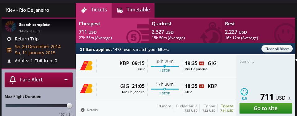 Такие цены можно встретить на агрегаторах типа момондо, скайсканер, а они уже вас переправят на нужного агента.cgistalker писав:На каком сайте есть билеты по такой цене?andrewcrow писав:Шикарная цена на новогодние праздники из Киева в Рио-Де-Жанейро за 711 USD