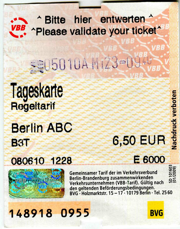 Day Pass Berlin ABC 6,50 Действует с момента компосирования и до 3 часов ночи следующего дня