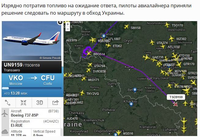 http://www.vedomosti.ru/companies/news/ ... -na-poletyАвиакомпания "Трансаэро" предложила обратиться в Минскую группу ОБСЕ, чтобы отменить запрет на транзит в украинском воздушном пространстве для крупных российских перевозчиков. Об этом пишет Лента.ру со ссылкой на газету "Ведомости" со ссылкой на гендиректора компании Ольгу Плешакову.