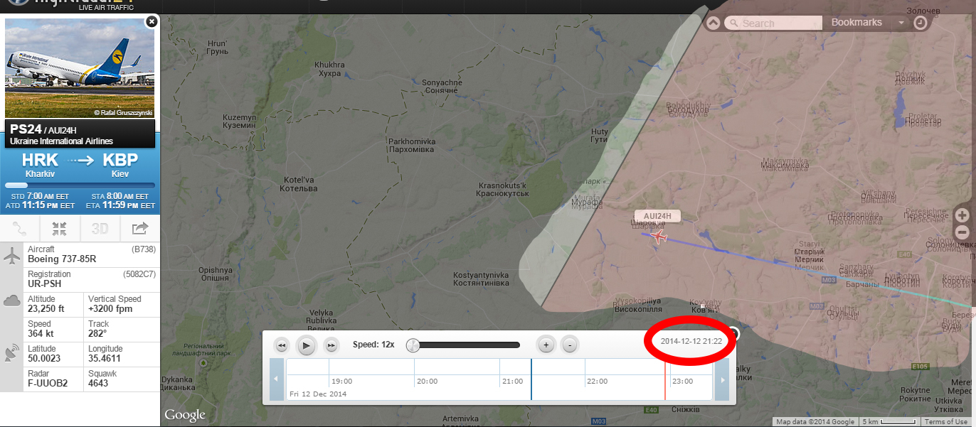 A2370/14 - TEMPO RESTRICTED AREA BOUNDED BY COORDINATES: 502057N 0353649E 484116N 0341010E 473832N 0335754E 461430N 0345437E 452945N 0364142E 460809N 0370518E 462230N 0361200E 465812N 0360018E 473846N 0353706E 475542N 0355136E 481520N 0360510E 483900N 0362630E 490630N 0365000E 494030N 0364948E 501920N 0364942E THEN ALONG STATE BOUNDARY UNTIL POINT 502057N 0353649E CLOSED. SFC - UNL, 12 DEC 21:15 2014 UNTIL 14 DEC 23:59 2014 ESTIMATED. CREATED: 12 DEC 20:54 2014AUI24H Рейс МАУ який мав летіти ранком... видно його одразу ж оповістили (або вони знали заздалегіть), щоб не стояти в Харкові - вилітає на Київ. В 21:13 UTC злітає з UKHH.