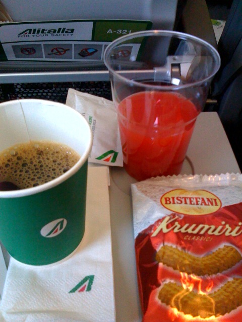 Alitalia кормит этим на всех европейских рейсах (вместо печенья можно взять нечто похожее на солёные сушки). Выбор напитков крайне скудный. При частых перелётах от этого набора еды можно впасть в депрессию.