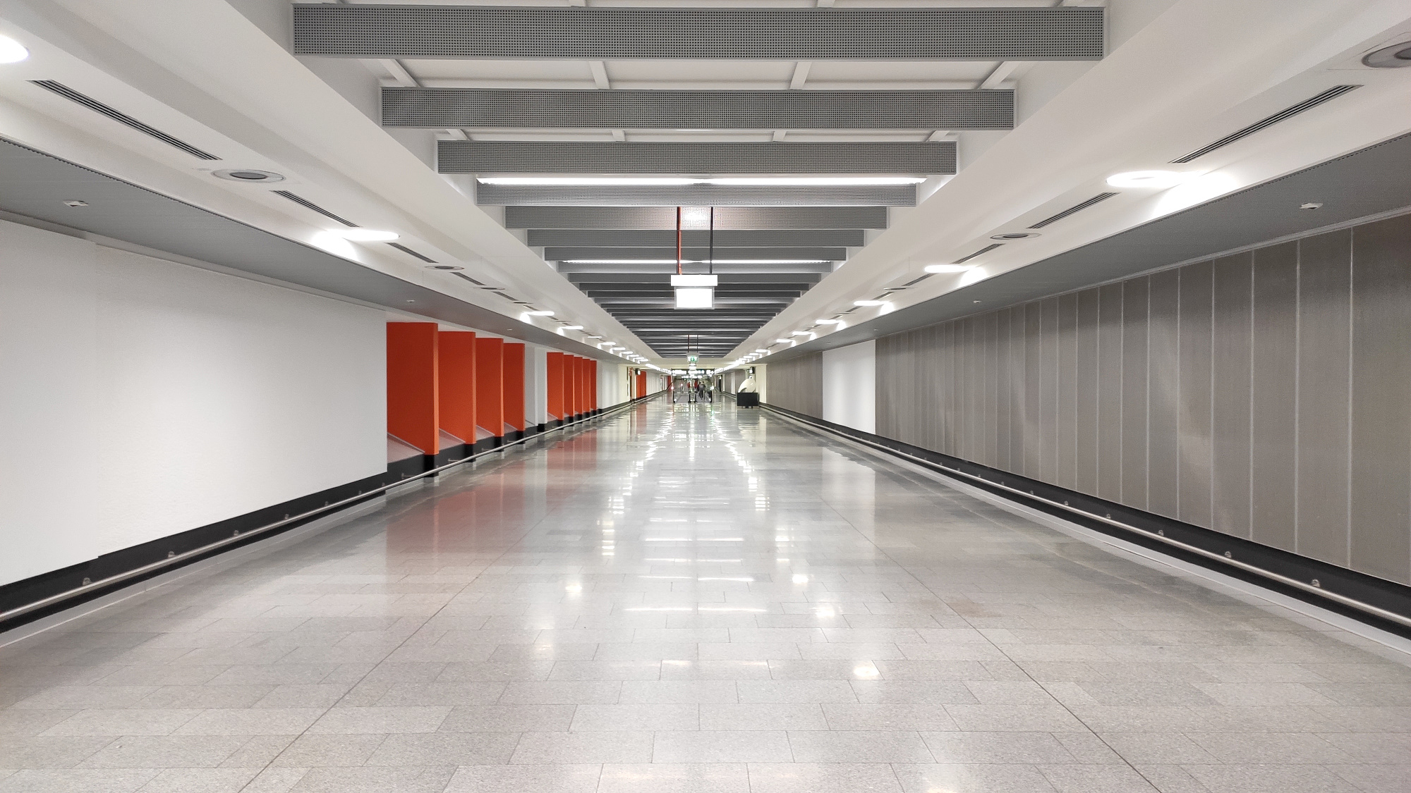Это переход уже как бы и не в аэропорту, он идёт от терминала и жд станции до отеля Moxy и дальней парковки.