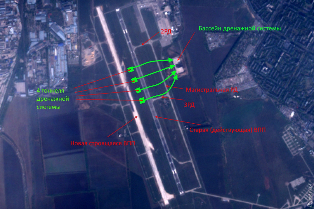 В ближайшие два месяца к этому бассейну предстоит подвести четыре трубы большого диаметра. Они пройдут под старой взлетно-посадочной полосой и магистральной рулежной дорожкой. Трудность заключается в том, что аэропорт закрывать нельзя, полеты должны продолжаться, а это значит, что надо делать подземное горизонтальное сверление .