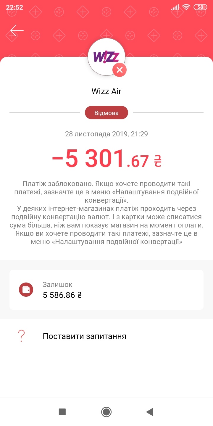 Впервые за многочисленные покупки билетов на визз Моно выдает сообщение о двойной конвертации. Всегда беру в оригинальной валюте и не сталкивался с подобным. И в этот раз билеты с вылетом из Украины были в гривне, но пришел отказ. Возможно, как-то связано с тем, что часть изначального счета оплачивалась визз-кредитами за изменение рейса, которые были перечислены на внутренний счет в злотых.