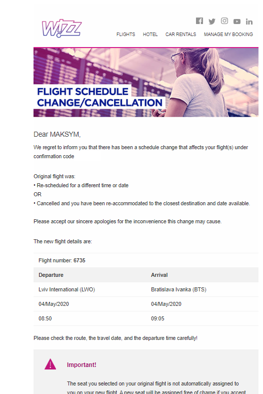Це лист який прийшов на пошту, з запропонованим вильотом на 4 травня. В свому кабінеті на сайті Візз можна було зробити перебронювання, на вибір Львів-Братислава на наступні дати, або Київ-Братислава, Київ-Відень, Київ-Будапешт.
