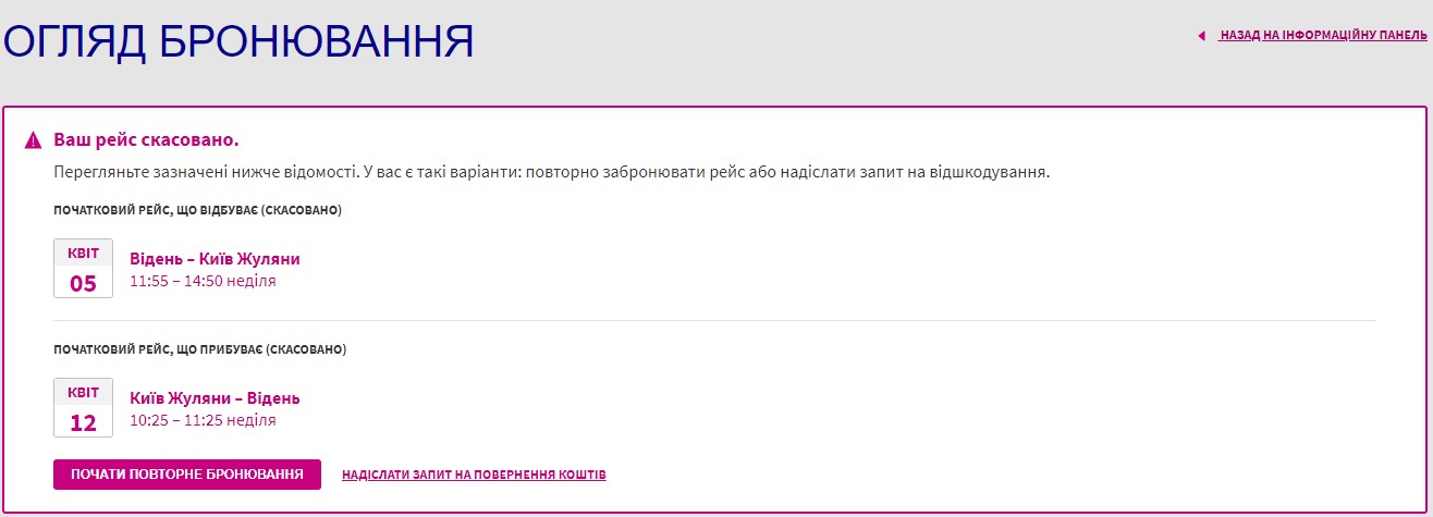 Бронювання на рейс 19 березня було ще видно в системі вночі на 19 число, за 6-7 годин до вильоту; реєстрація на рейс була доступна незважаючи на мейл з повідомленням про його відміну.