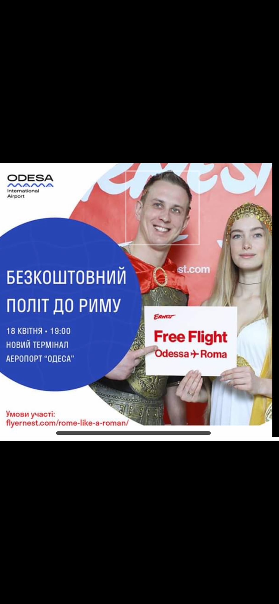 Присоединяйся к празднованию первого полета Ernest Airlines из Одессы в Рим — приходи в костюме древнего римлянина и получи шанс выиграть бесплатную поездку!