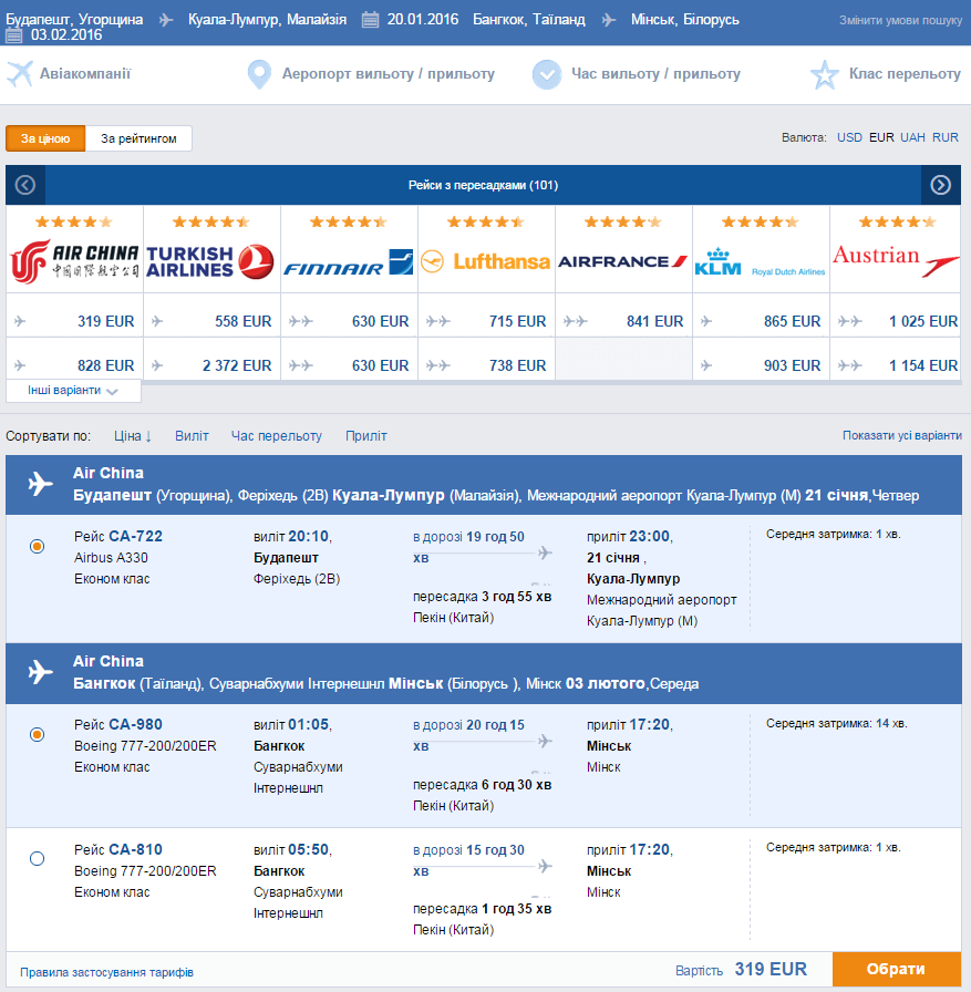 20 січня Будапешт – Куала-Лумпур 319 € AirChina