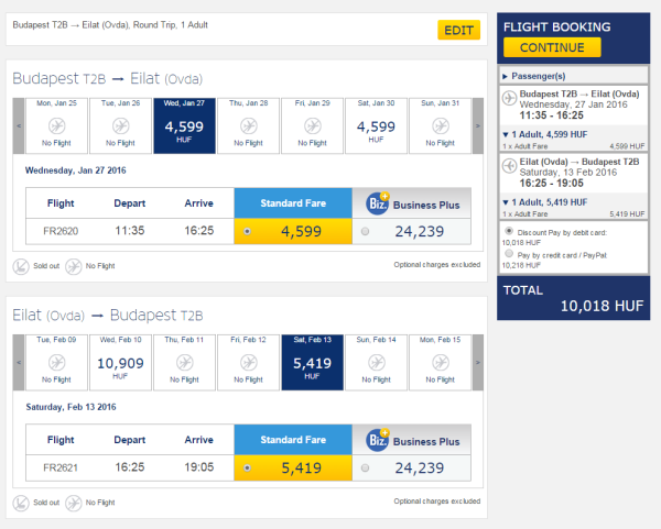 27 января — 13 февраля Будапешт – Эйлат – Будапешт — 15 € (4 599 HUF) + 17 € (5 419 HUF)