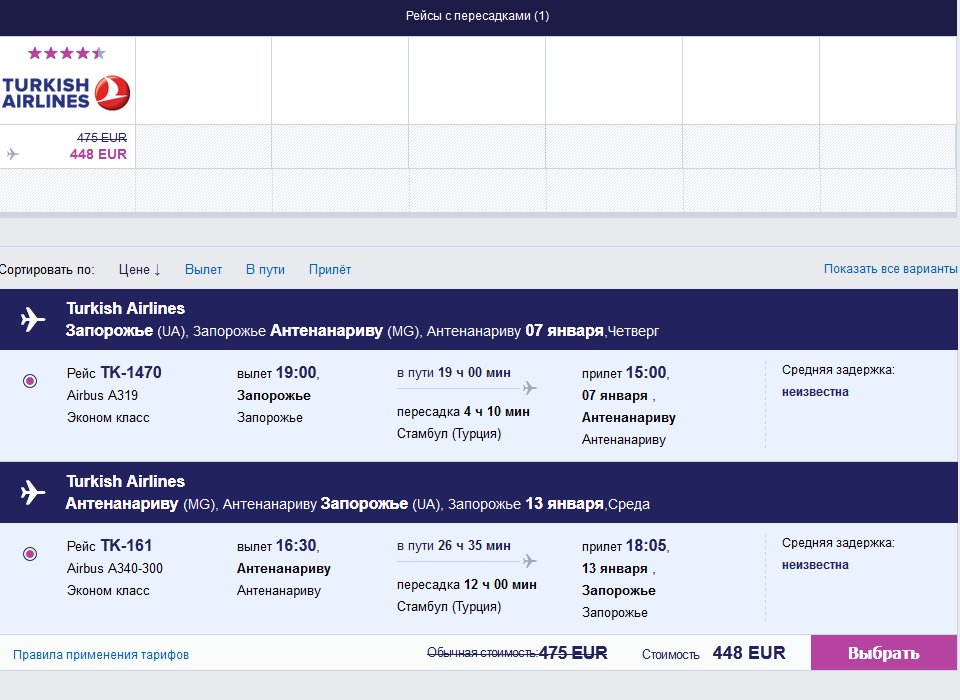 Пример бронирования в январе, Киев — Мадагаскар — Киев за 584 евро: