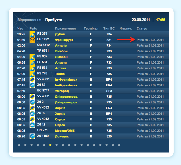 И какой толк от такого расписания? Раньше люди могли зайти и мониторить статистику задержек нужного рейса, т.к. вчерашнее табло было доступно. А что теперь? Кроме того, замучаешься клацать на эти кружочки внизу, почему не сделать одно табло — длинное как и было, но в новом дизайне? Я уже умолчу о том, что логотипы авиакомпаний это круто, но ведь большинство пассажиров не разбирается в этих всех кодах и логотипах. Сделайте логотип больше, чтобы там было и название компании видно, как это реализовано на сайте харьковского аэропорта, или добавьте дополнительную ячейку для названия авиакомпании текстом. Если и менять, то надо улучшать, делать понятнее. А что имеем в итоге?
